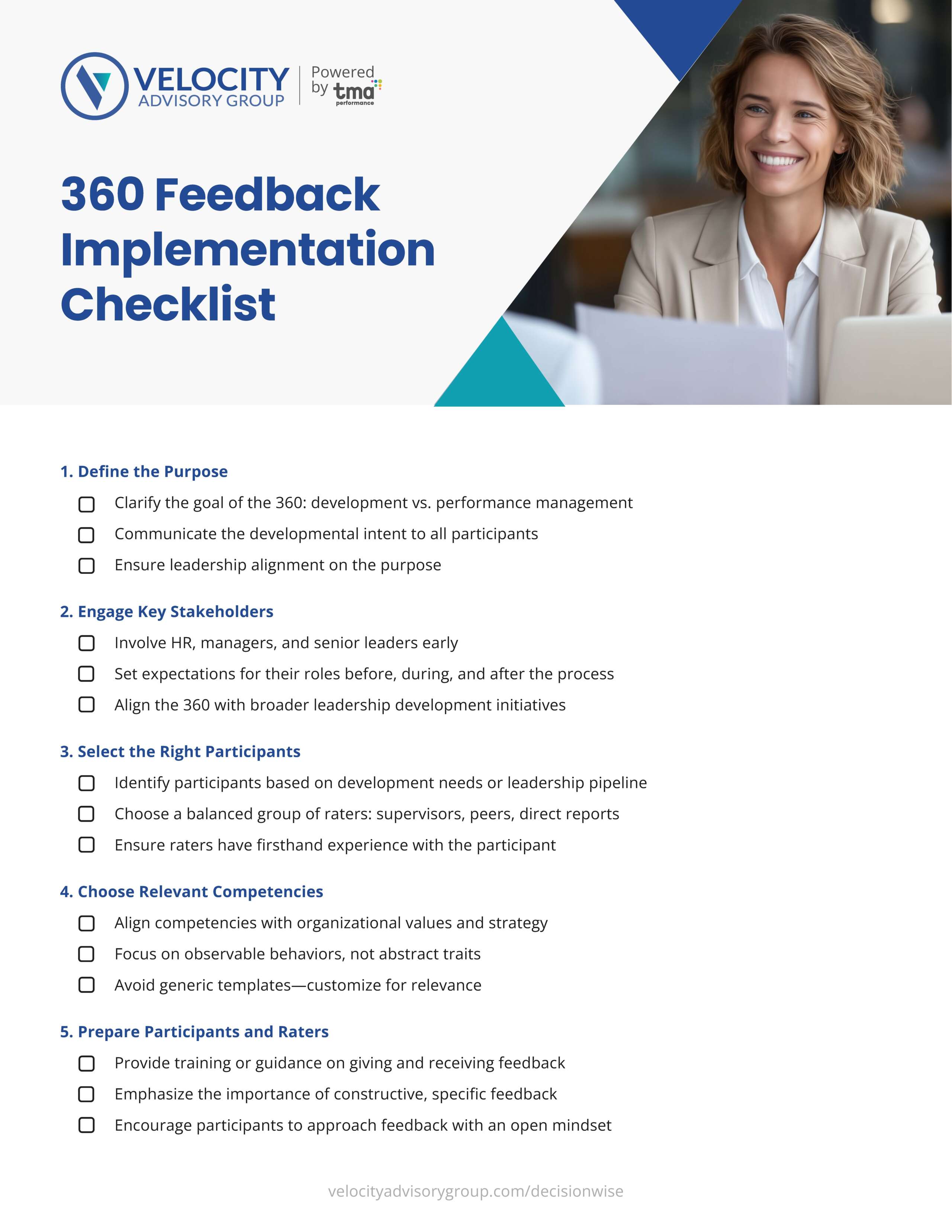 The quality of the feedback depends on who gives it. Select raters who work closely with the participant and can provide meaningful, firsthand insights. This should be a balanced group of supervisors, peers, and direct reports. Feedback from the right mix of people builds credibility and trust in the results.